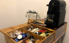 Koffietoestel met koffie pads gratis ter beschikking, alsook diverse soorten thee, koekjes, melk en suiker.